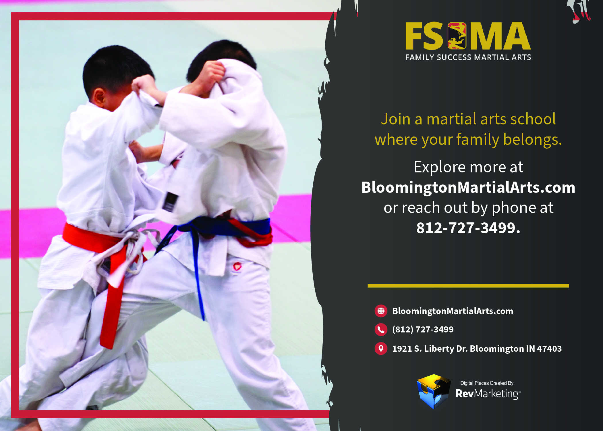 Join a martial arts school where your family belongs. Explore more at BloomingtonMartialArts.comor reach out by phone at 812-727-3499 .